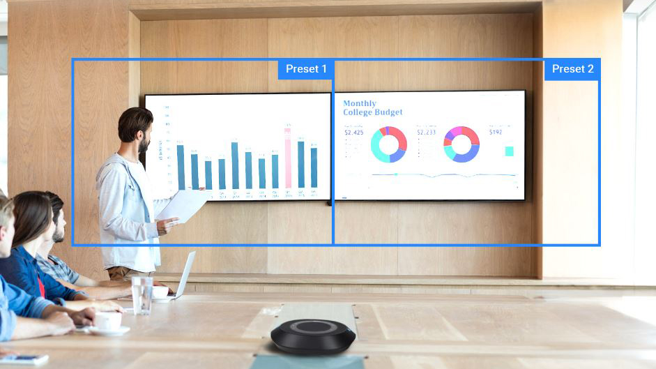 AVer's CAM520 Pro3 optimizes your meeting efficiency with its advanced SmartFrame technology. This AI feature automatically centers on participants, even from a remarkable distance of up to 22' away, ensuring precise people counting and clarity, even when masks are worn. Additionally, the CAM520 Pro3 provides a Preset Framing mode that intelligently tracks presenters within predefined zones. By configuring multiple preset viewing areas, the camera smoothly adjusts as the presenter moves, eliminating the need for manual control.