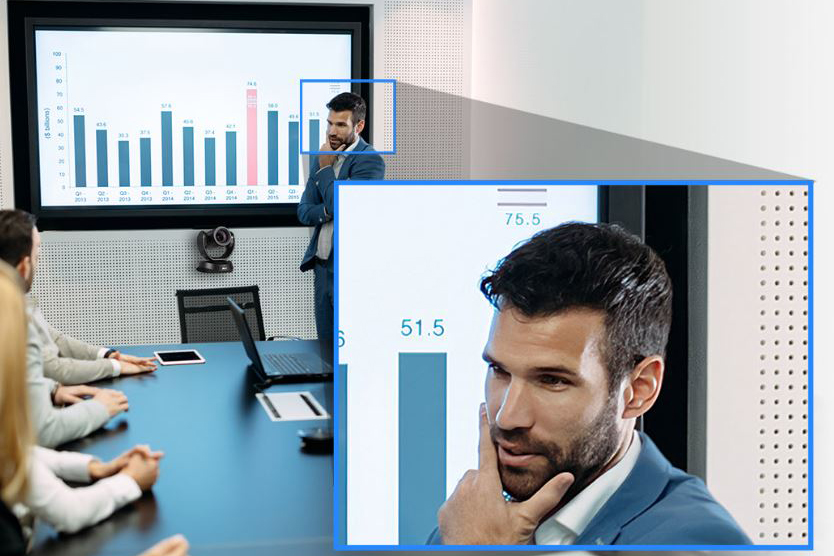 The camera's 80.5° diagonal field of view enables wide shots, and its flexible pan and tilt controls allow focus on presenters, attendees, whiteboard content, or physical objects. Ensure precision with a 12x optical lens and a 36x total zoom (with 6x digital zoom enabled), reaching up to 70' without distortion. The CAM520 Pro3 boasts 24x lossless zoom for exceptional clarity in remote meetings, making it the ultimate video conferencing system for medium to large rooms.